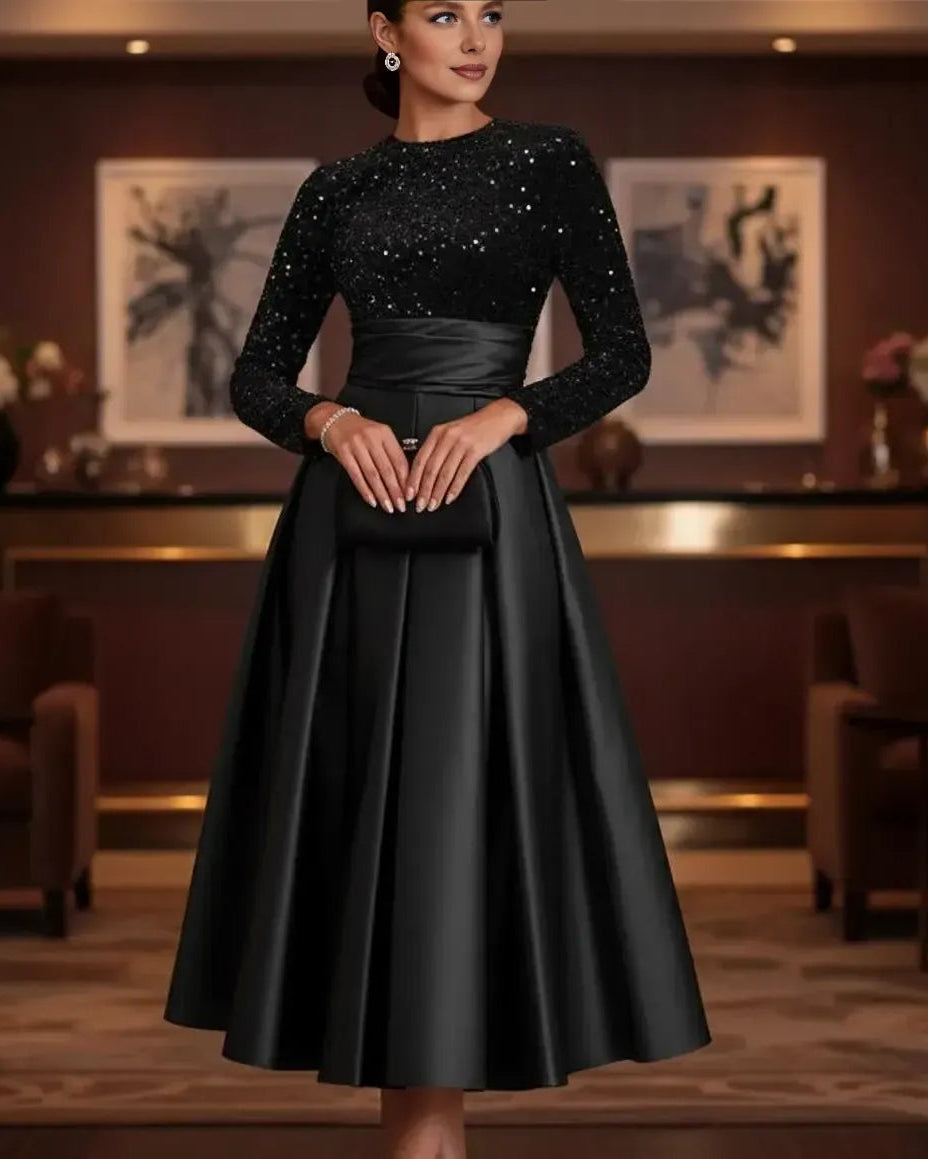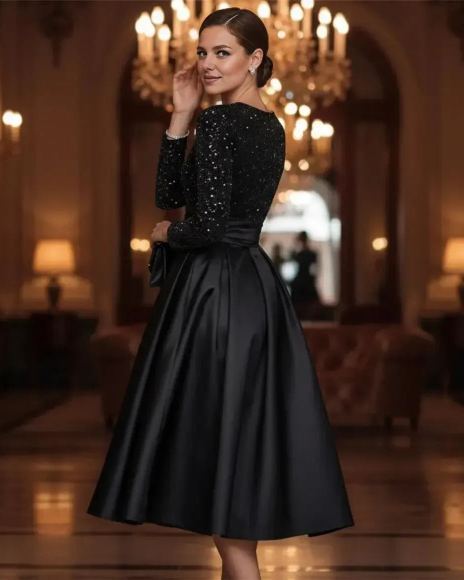 weitese's black two-piece midi ball gown features a long-sleeve sequin top (for shimmering detail) and a voluminous satin skirt. The combination of glittering sequins and structured satin balances opulent glamour with timeless sophistication, making it ideal for cocktail parties, city galas, or upscale evening events—combines classic black with eye-catching, modern design.