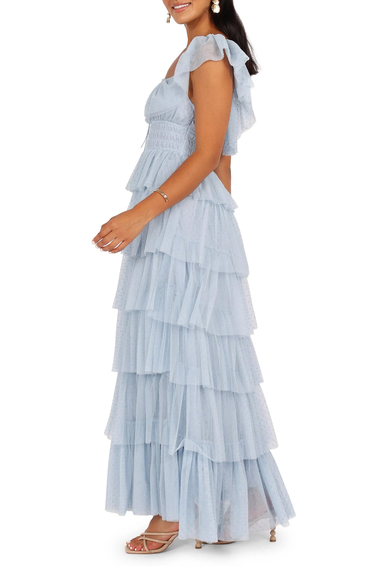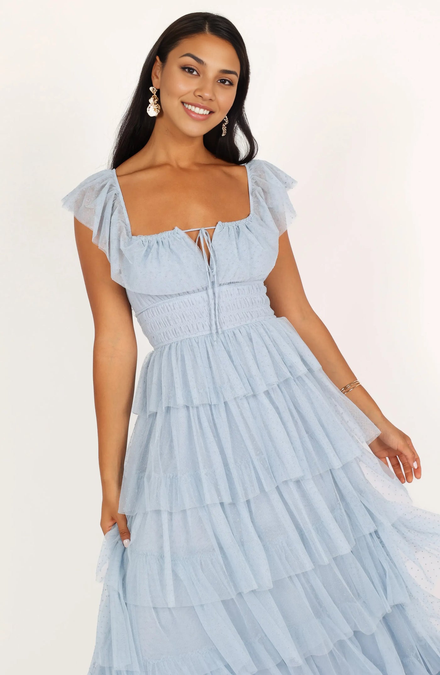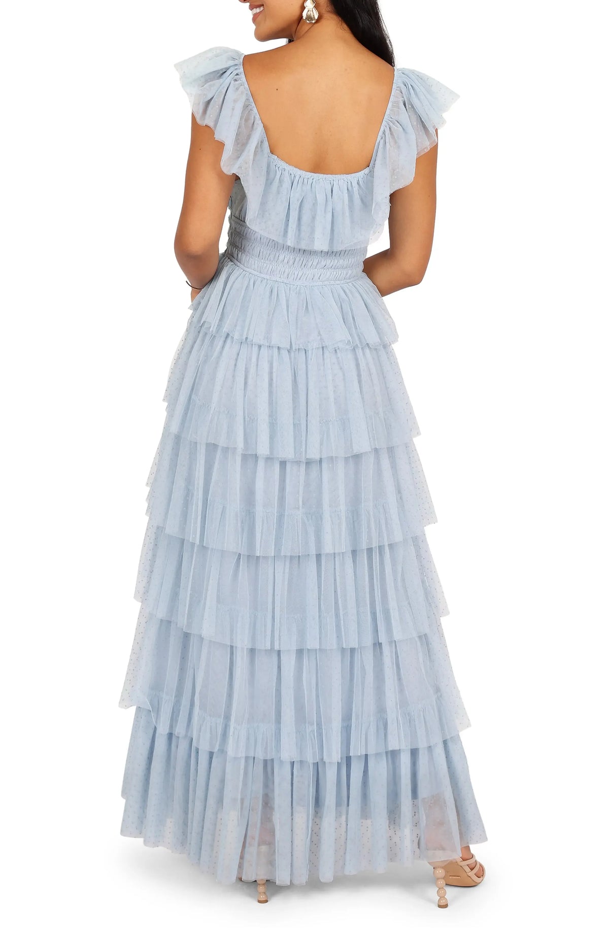 weitese's Elevate your whimsical allure with this light blue polka dot tulle tiered gown. It features delicate polka dot tulle fabric with ruffle sleeves and a square neckline with tie-front detail for opulent charm, a voluminous tiered skirt that adds romantic movement, and a smocked waist for refined fit. The soft light blue hue ensures a captivating finish, making it perfect for weddings, garden parties, or any occasion where you want to embrace feminine luxury with show-stopping style.