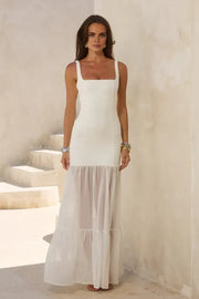 weitese's Elevate your formal style with this white square neck maxi dress. It features a structured square neckline, a fitted bodice, and a flowing tiered chiffon skirt that adds a touch of romance. Perfect for beach weddings, garden events, or any upscale occasion, this dress combines sophistication and comfort seamlessly. The tailored fit and elegant drape make it a timeless choice. Pair it with gold jewelry and neutral heels to complete a refined ensemble.
