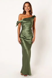 weitese's Elevate your sophisticated allure with this olive green satin one-shoulder maxi dress. It features luxurious satin fabric with a one-shoulder neckline that accentuates the collarbone, bow details for playful charm, and a ruched silhouette that defines curves. The rich olive green hue makes it perfect for formal events, evening galas, or any occasion where you want to embrace elegant, show-stopping style.