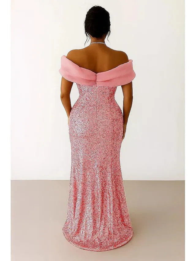 weitese's glamorous hot pink gown features an off-the-shoulder ruffle neckline, full-body sequin embellishments (for a shimmering effect), a form-fitting mermaid silhouette, and a subtle train. The bold design balances playful charm with red-carpet allure—ideal for proms, evening galas, or formal celebrations. Its vibrant hue and eye-catching details create a show-stopping, elegant look.