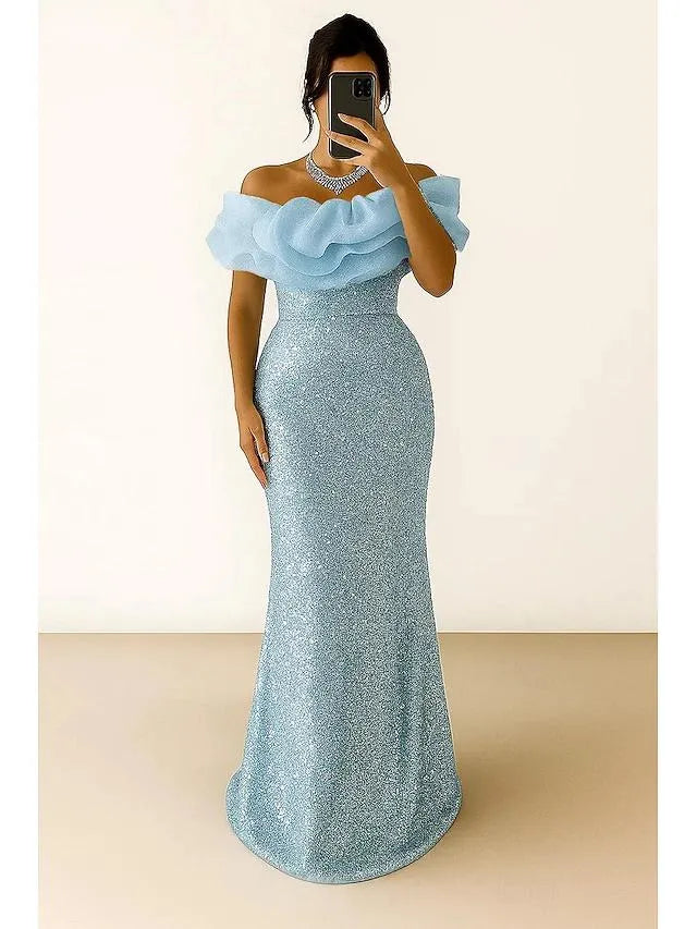 The Elegant Mermaid/Trumpet Off Shoulder Sleeveless Sequins Prom Dress For Sale does not include any accessories shown in the picture, such as a cape/jacket, gloves, veil, handbag, etc.