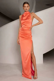 weitese's Elevate your formal style with this coral satin halter maxi dress. It features a sophisticated high halter neckline, a figure-hugging silhouette with ruched detailing, a dramatic high slit, and an alluring open back with a flowing tie detail. Crafted from luxurious satin fabric, this dress is perfect for red carpet events, weddings, or any high-end occasion. The vibrant color and tailored fit offer both glamour and comfort. Pair it with gold jewelry and metallic heels to complete a sophisticated ensemble.
