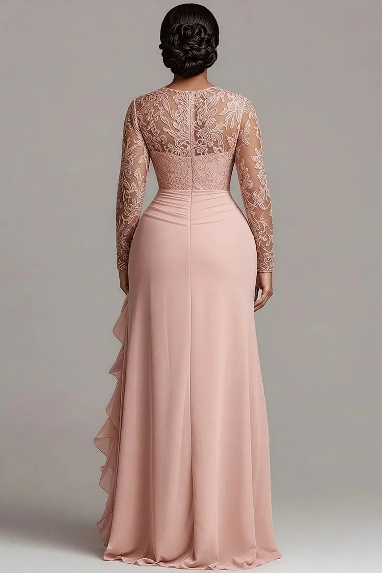 weitese's blush pink mermaid gown features a long-sleeve lace illusion bodice (with intricate floral embroidery), a ruched chiffon skirt, and a dramatic high slit (adorned with flowing ruffles). The soft blush tone and contrast of delicate lace with lightweight chiffon balance romantic elegance with modern sophistication, making it ideal for spring weddings, bridal showers, or upscale evening parties—combines flattering silhouettes with polished, feminine allure.