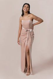 weitese's Elevate your luxurious and feminine style with this blush pink velvet strapless maxi dress. It features plush velvet fabric that exudes opulence, a strapless neckline with structured corset detailing for a tailored fit, a waist tie for added elegance, and a high slit for dynamic movement. The floor-length silhouette makes it perfect for formal events, holiday gatherings, or any occasion where you want to embrace rich, sophisticated glamour.