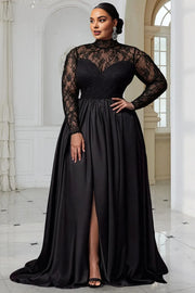 weitese's plus-size black gown features a sheer lace mock neck (with intricate floral patterns), long lace sleeves, a voluminous satin ballgown skirt (with a dramatic high slit), and a subtle train. The timeless black tone and contrast of delicate lace with sleek satin balance regal elegance with modern allure, making it ideal for black-tie galas, formal wedding receptions, or upscale evening events—combines flattering tailoring with polished, confident charm.