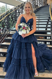 Formal Wear Dresses/Cute A Line Navy Blue Tiered Tulle Long Prom Dresses with Slit/Prom Dress Shop