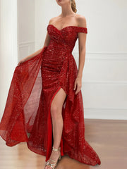 Formal Women's Dresses Sheath/Column Off-the-Shoulder Short Sleeves Floor-length Evening Dresses with Split Side Prom Dress Prom Dress Shops