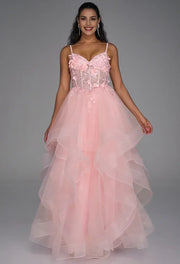 weitese's blush pink tulle ball gown features thin spaghetti straps, a sweetheart neckline, a corset bodice (adorned with 3D floral embroidery), and a voluminous layered ruffled skirt. The lightweight tulle fabric and soft pastel tone balance fairy-tale romance with delicate artistry, making it ideal for bridal showers, prom, or fairy-tale-themed weddings—combines feminine charm with opulent, dreamy design.