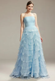 weitese's light blue strapless ballgown features a ruched satin bodice, a voluminous ruffled tulle skirt (adorned with delicate sequin trim), and an open back. The soft sky-blue tone and contrast of sleek satin with airy tulle balance whimsical femininity with elegant glamour, making it ideal for spring weddings, prom events, or fairy-tale themed galas—combines flattering silhouettes with polished, dreamy allure.