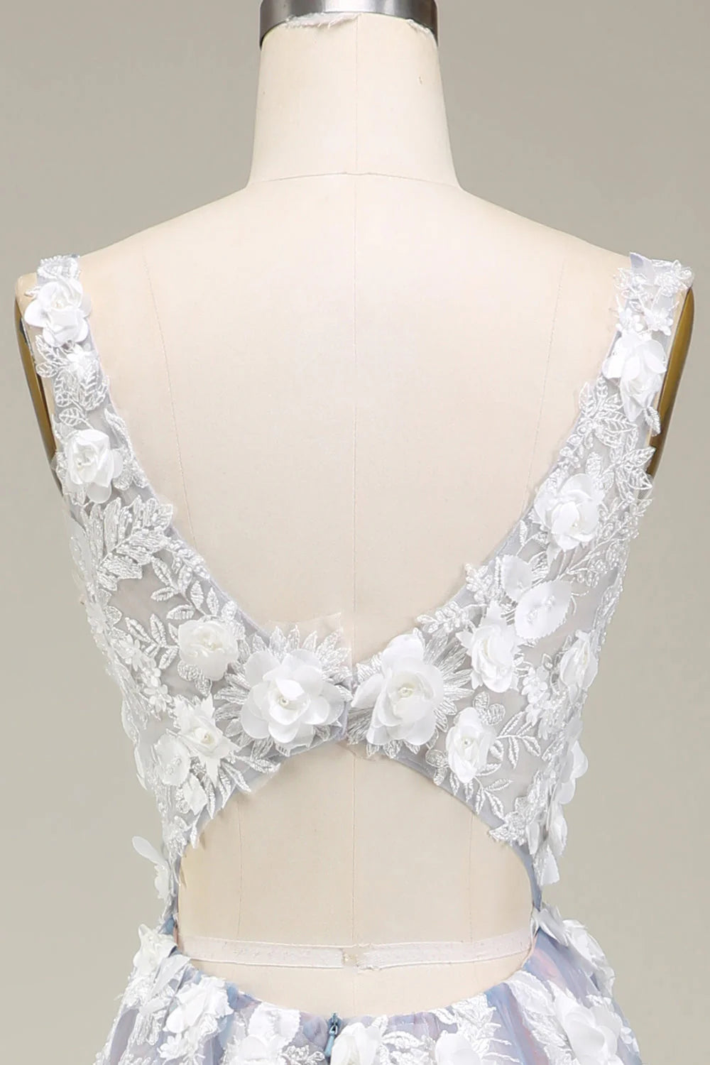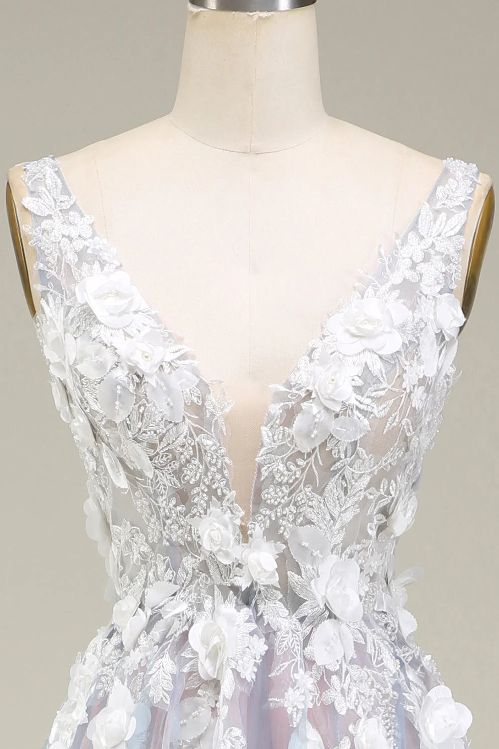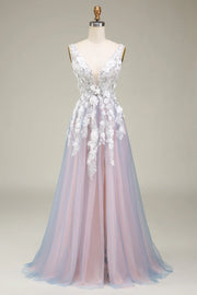Grey Pink Gorgeous A Line Deep V Neck Long Prom Dress With Appliques