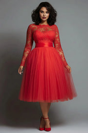 weitese's plus-size red midi gown features a sheer lace illusion bodice (with intricate floral patterns), long lace sleeves, a cinched satin waist, and a voluminous tulle ballgown skirt. The bold red tone and contrast of delicate lace with airy tulle balance playful femininity with confident glamour, making it ideal for holiday parties, Valentine’s events, or semi-formal evening gatherings—combines flattering silhouettes with polished, eye-catching allure.