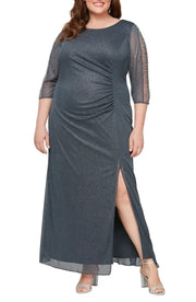 weitese's Elevate your glamorous allure with this plus size dusty blue glitter maxi dress. It features shimmering glitter fabric with beaded sheer sleeves for opulent charm, a ruched design at the waist that flatters the silhouette, and a high slit for dynamic movement. The tailored fit and elegant dusty blue hue make it perfect for formal events, evening galas, or any occasion where you want to embrace sophisticated, show-stopping style.