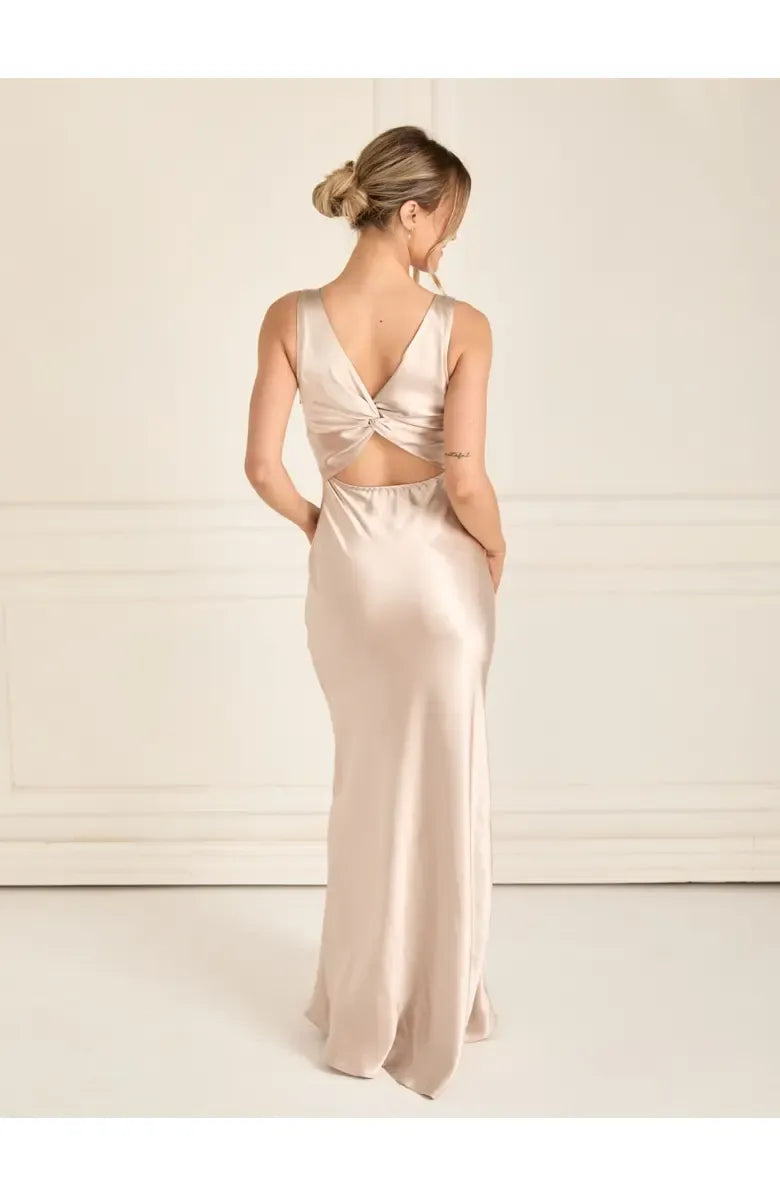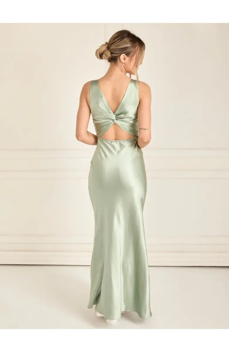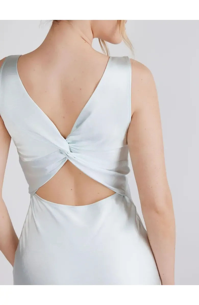 weitese's Elevate your elegant allure with this pale blue satin plunging V-neck mermaid maxi dress. It features luxurious satin fabric with a daring plunging V-neck for bold charm, a twisted open back that adds tailored sophistication, and a figure-hugging mermaid silhouette that accentuates curves. The soft pale blue hue and flowing train make it perfect for formal events, weddings, or any occasion where you want to embrace refined, show-stopping glamour.