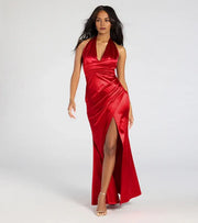 weitese's Step into elegance with this red satin maxi dress. It features a halter neck design that adds a touch of sophistication, ruched detailing that enhances your figure, and a high side slit for graceful movement. The tying detail at the neck adds alluring charm, making it perfect for formal events, galas, or any occasion where you want to make a bold and stylish statement.