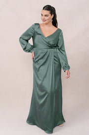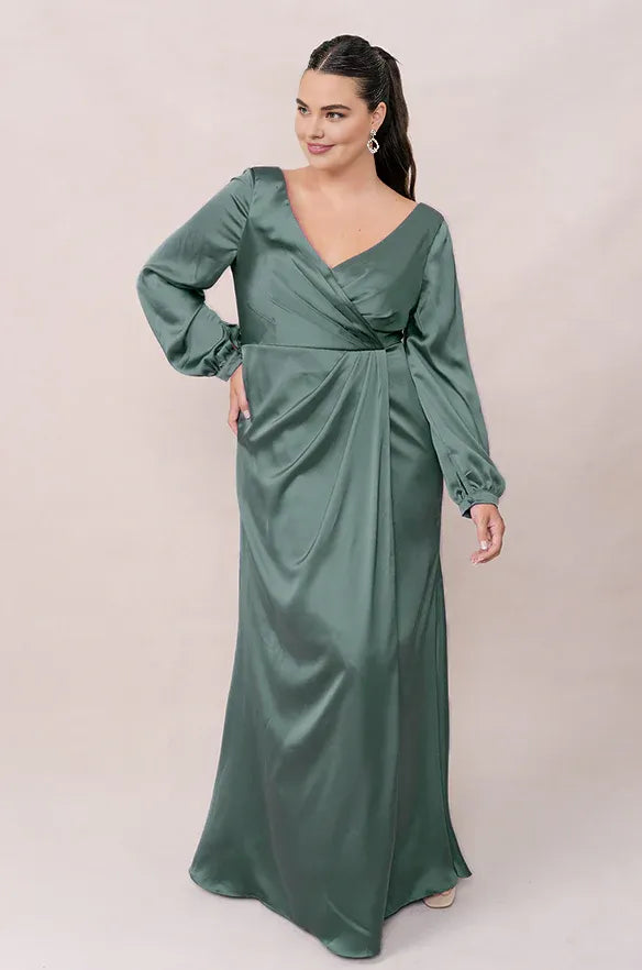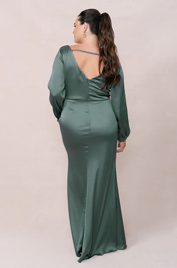 weitese's Elevate your elegant and inclusive style with this sage green satin V-neck maxi dress, designed for plus-size figures. It features luxurious satin fabric that drapes beautifully, a deep V-neckline for a flattering fit, long puff sleeves for sophisticated detail, and an open back design for unique charm. The floor-length silhouette makes it perfect for formal events, weddings, or any occasion where you want to embrace timeless, refined glamour.