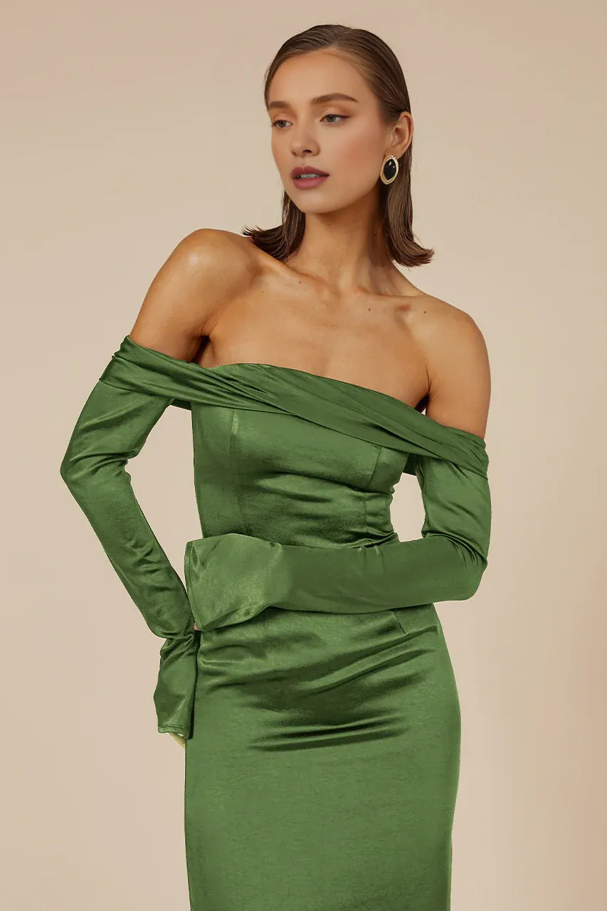 weitese's elegant sheath maxi dress features an off-shoulder neckline, long sleeves, and an open back with a subtle slit. Crafted from lustrous emerald satin, it boasts a tailored silhouette that balances sophistication with modernity—ideal for formal dinners, upscale gatherings, or semi-formal events. The smooth fabric and structured design create a timeless, refined look.