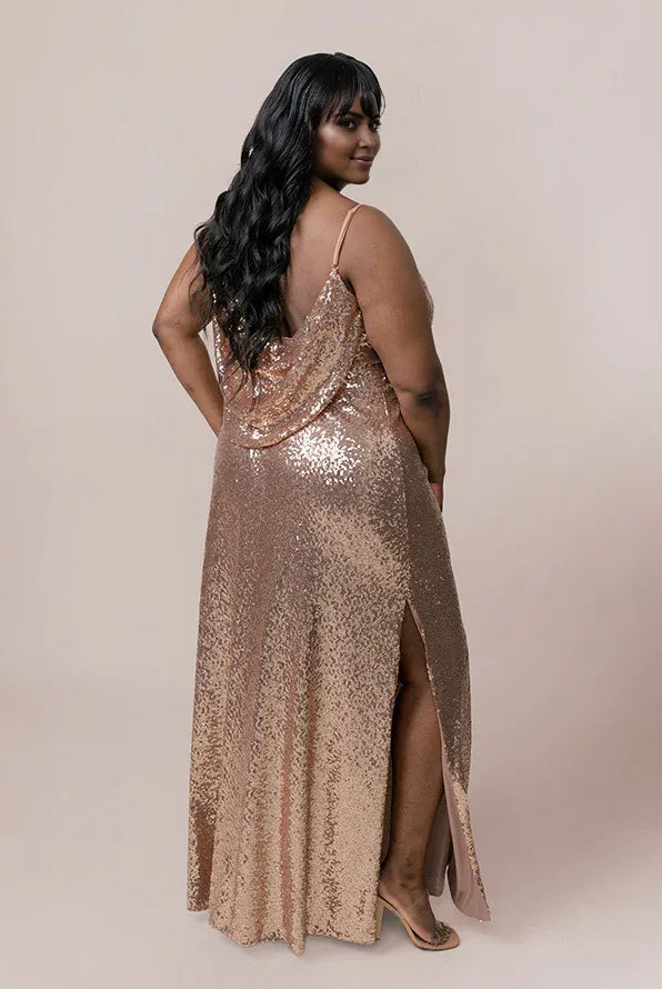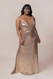 weitese's Elevate your glamorous and inclusive style with this plus size rose gold sequin cowl neck maxi dress. It features shimmering sequin fabric that radiates sparkle from every angle, a cowl neckline for elegant drape, and a high slit for dynamic movement. The adjustable spaghetti straps and open back add a touch of allure, making it perfect for formal events, celebratory occasions, or any moment where you want to embrace bold, timeless glamour with confidence.