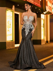 weitese's elegant prom dress features a sparkle trumpet/mermaid silhouette that flatters your figure with a sweep/brush train for graceful movement. Its illusion neckline and sleeveless, backless design offer a sophisticated yet alluring touch. Perfect for making a memorable impression at formal events, this dress combines timeless style with modern detailing for a refined look.