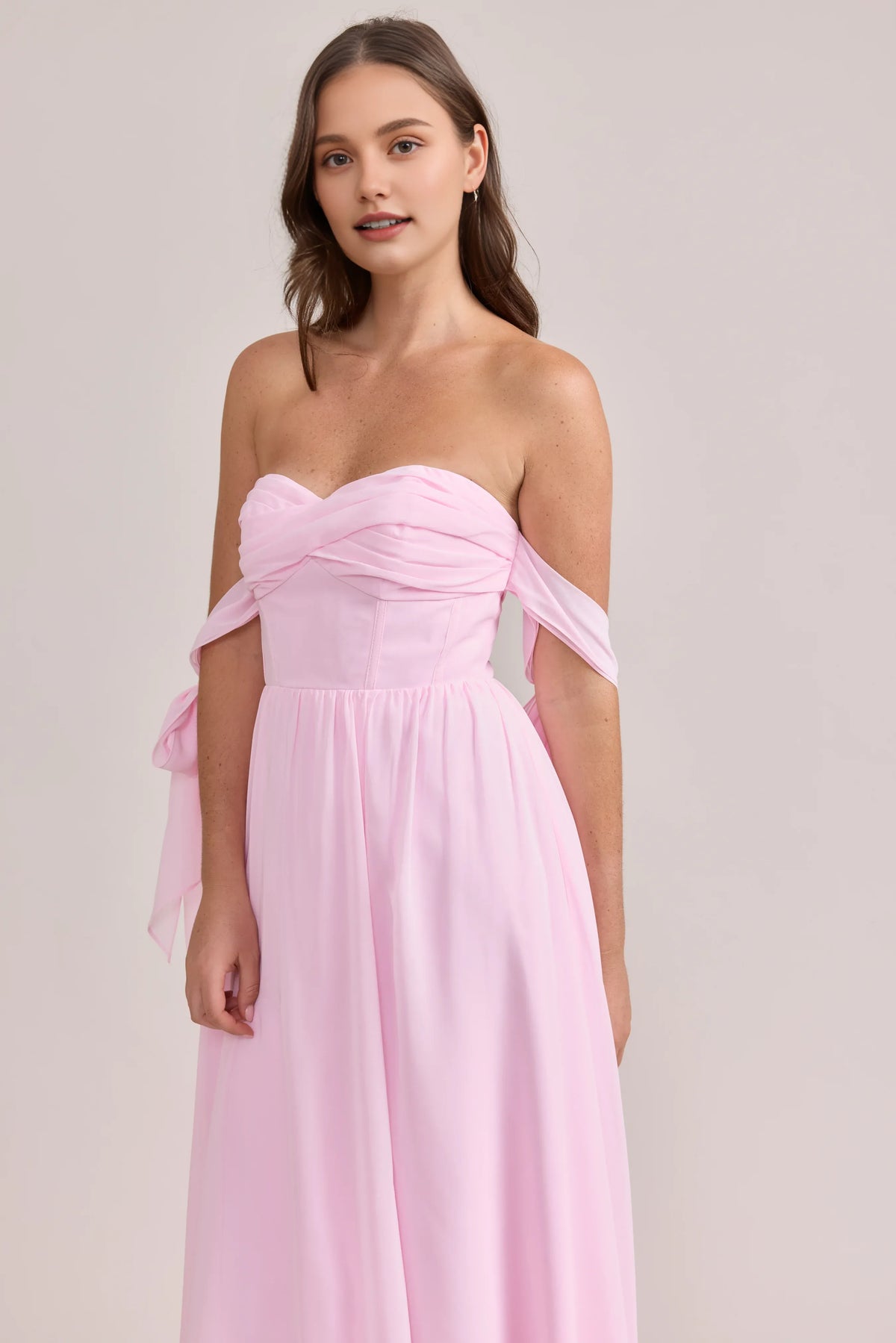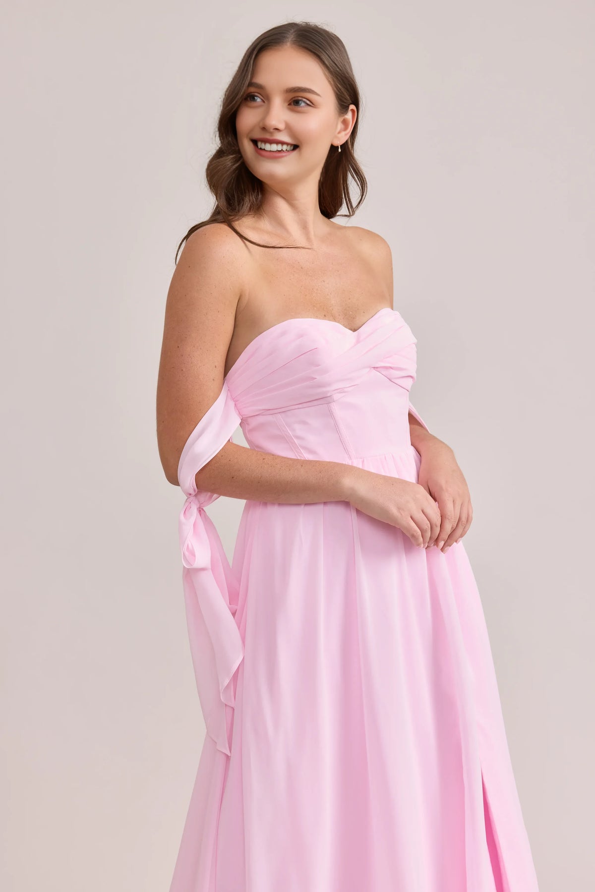 weitese's Elevate your romantic and feminine style with this light pink chiffon strapless maxi dress. It features a strapless neckline with ruched detailing for a flattering fit, tie-sleeve accents that add a playful touch, and a high slit for dynamic movement. The flowing chiffon skirt exudes elegance, making it perfect for weddings, bridal parties, or any occasion where you want to embrace soft, sophisticated glamour.