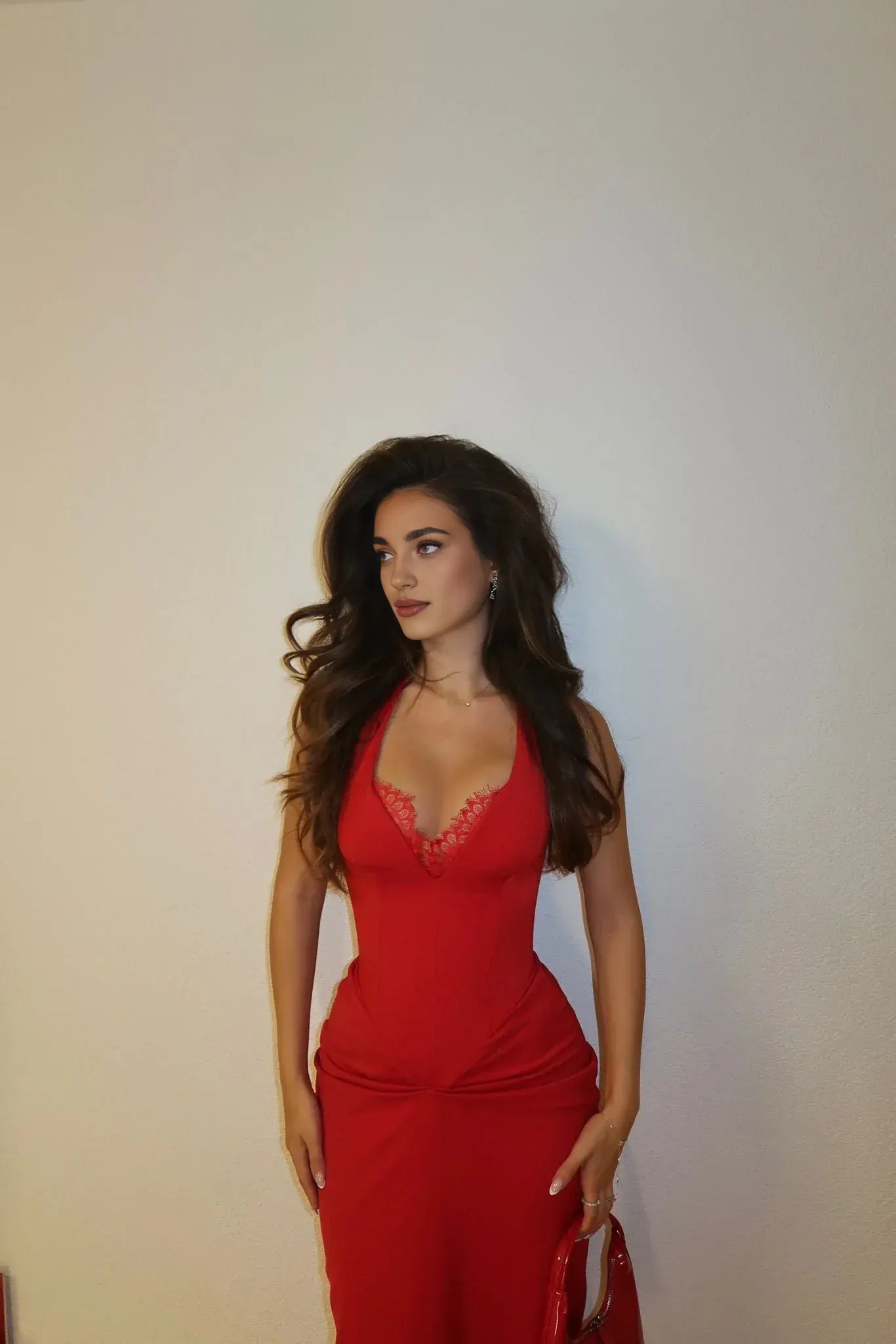 weitese's red gown features a plunging halter neckline with delicate lace trim, a figure-hugging silhouette, and a sweep train. The lightweight, stretchy jersey fabric and vibrant red hue balance modern sensuality with timeless elegance, making it ideal for proms, cocktail events, or romantic dinners—combines polished tailoring with feminine charm.