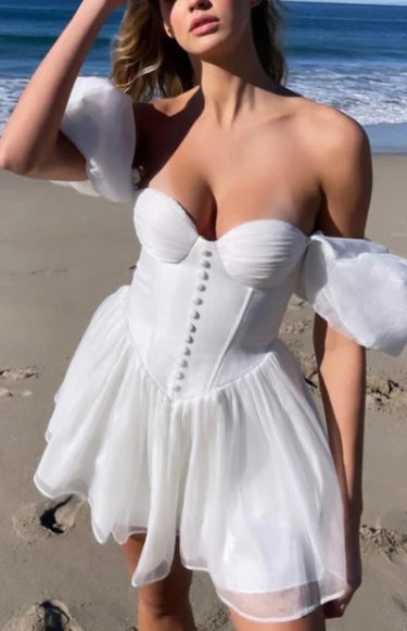 Tulle Off-the-Shoulder Strapless Puff Sleeve Corset Prom Dress