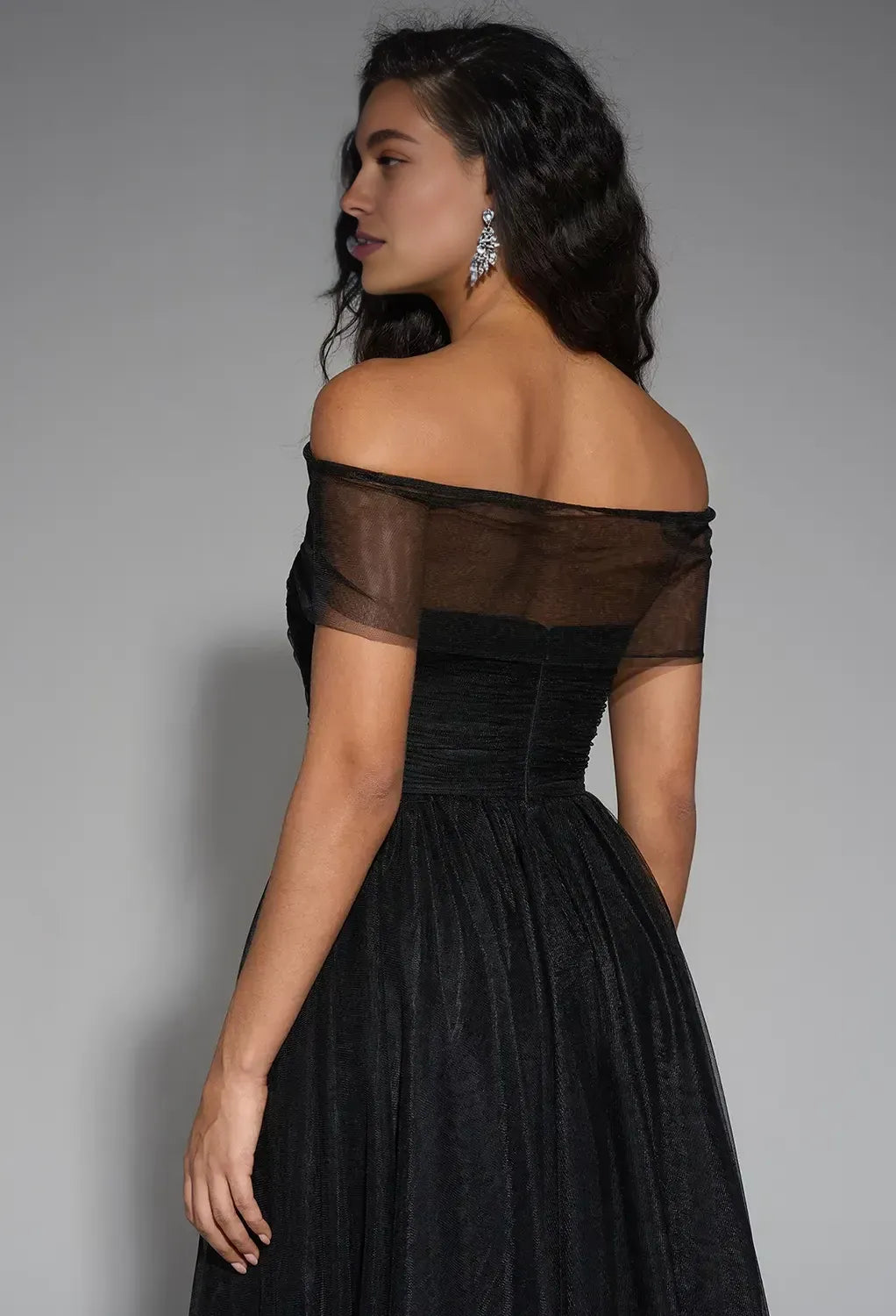 weitese's black tulle tea-length gown features an off-the-shoulder sheer neckline, a ruched bodice, a voluminous A-line skirt, and an open back design. The lightweight tulle fabric and sleek black tone balance modern sophistication with playful elegance, making it ideal for cocktail parties, evening receptions, or semi-formal events—combines understated glamour with refined, versatile design.