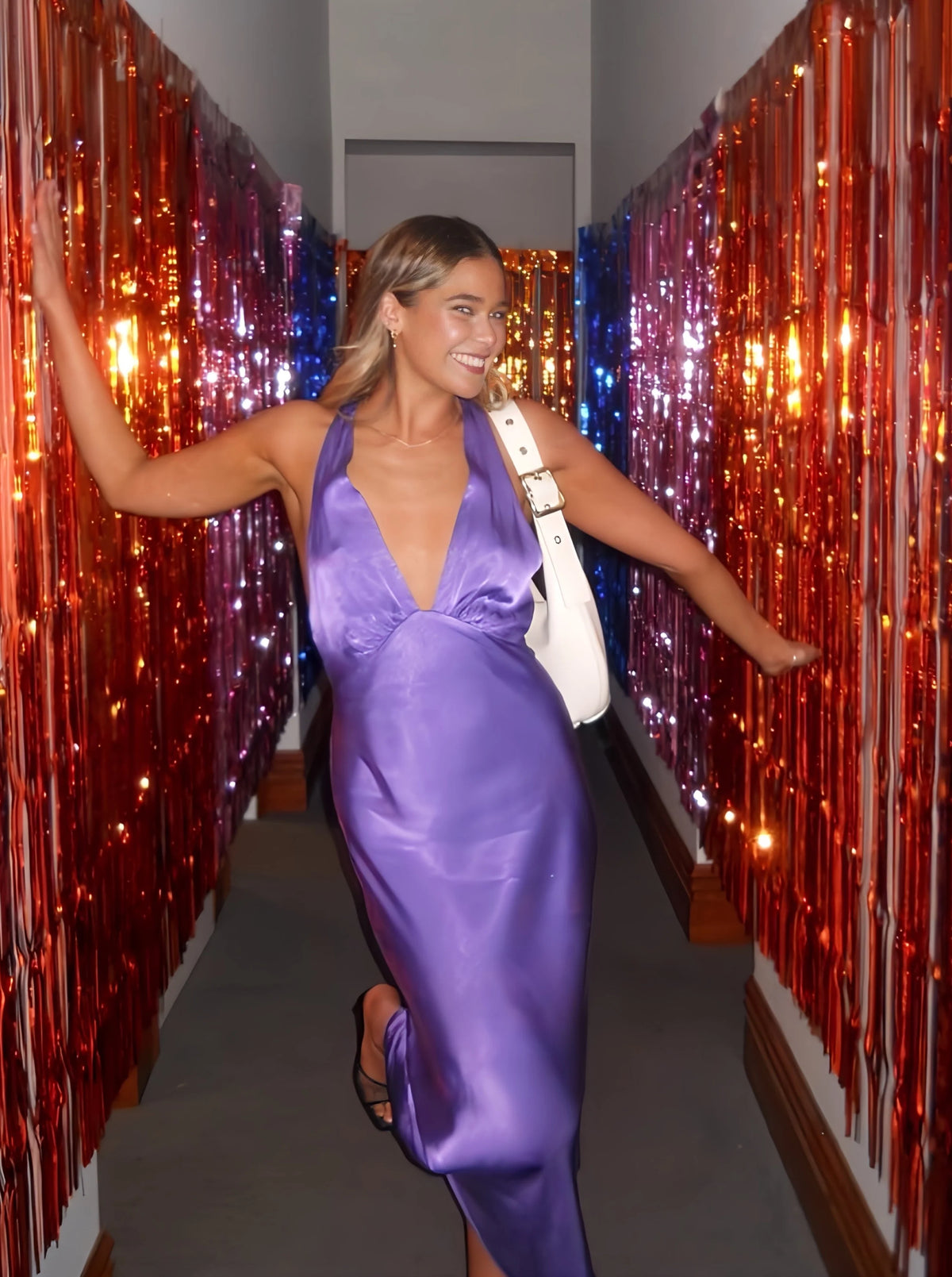 This stunning Weitese dress combines a sexy deep V neck with an open back design, creating a bold and alluring look. Perfect for formal occasions, the sleeveless floor length design adds elegance and sophistication. Elevate your style with this must-have dress.