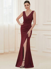 Weitese Front High Slit V-Neck Wrap Waist Knit Evening Dress - Burgundy / US 2 / UK 6 / EU 32