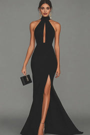 weitese's sophisticated black gown features a halter neckline with crystal embellishments, a keyhole front, an open back, and a form-fitting mermaid silhouette with a sleek high slit. The minimalist design paired with glamorous details exudes modern elegance, making it ideal for galas, weddings, or formal evening events.