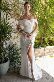 The Stunning Sheath/Column Off the Shoulder Sleeveless Satin Wedding Dress For Sale does not include any accessories shown in the picture, such as a cape/jacket, gloves, veil, handbag, etc.
