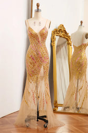 Sparkly Mermaid Spaghetti Straps Golden Sequins Floor Length Backless Prom Dress with Split Front