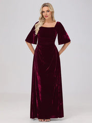 Simple A-Line Square Neck Half Sleeves Velvet Floor Length Mother of the Bride Dress - US 2 / UK 6 / EU 32