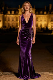 weitese's Shine with regal glamour in this purple velvet mermaid gown: featuring a deep plunging V-neck, sleek sleeveless silhouette, and a sparkling crystal-trimmed ruched detail. The lush velvet fabric drapes elegantly, balancing bold color with luxe shimmer—perfect for galas, weddings, or black-tie events. Timeless, sophisticated, and utterly eye-catching.