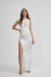 weitese's Elevate your formal style with this ivory one-shoulder satin maxi dress. It features a chic one-shoulder neckline, a high slit that adds movement and allure, and draped detailing that enhances the silhouette. Crafted from luxurious satin fabric, this dress exudes timeless elegance and is perfect for weddings, galas, or any upscale occasion. The soft ivory hue and sophisticated design make it a standout choice, ideal for pairing with gold jewelry and strappy heels to complete a refined ensemble.