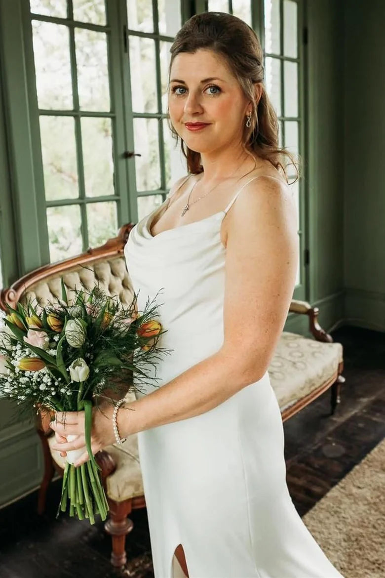 Spaghetti Straps Cowl Neck Backless Slit Long Wedding Dress With Train - US 2 / UK 6 / EU 32