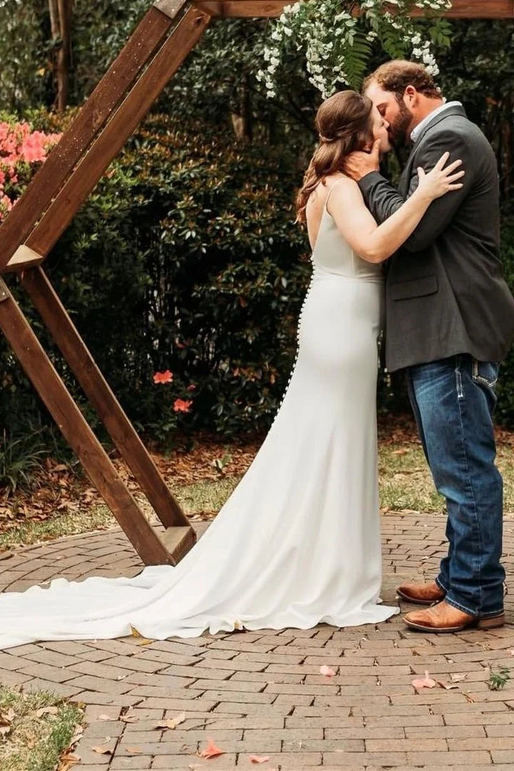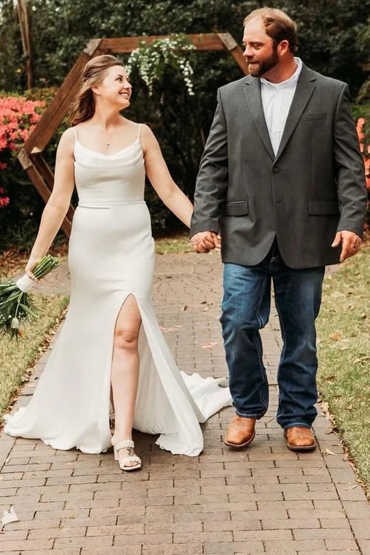 Spaghetti Straps Cowl Neck Backless Slit Long Wedding Dress With Train