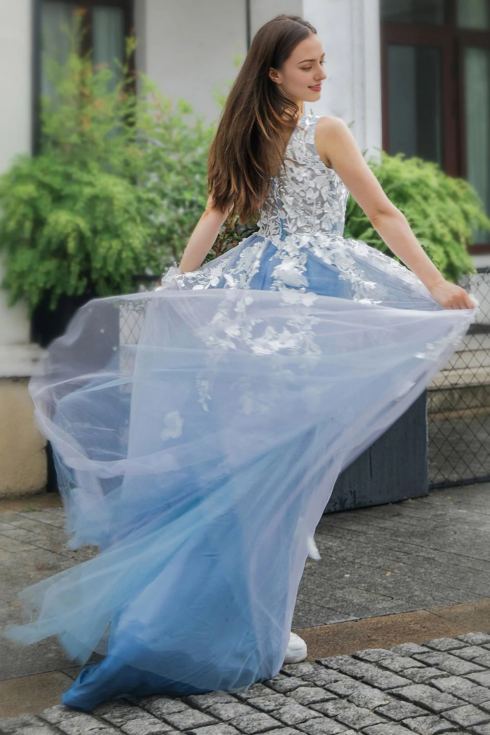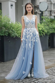 Vestido de fiesta de tul con escote en V, apliques azules, sin mangas, corte A y abertura