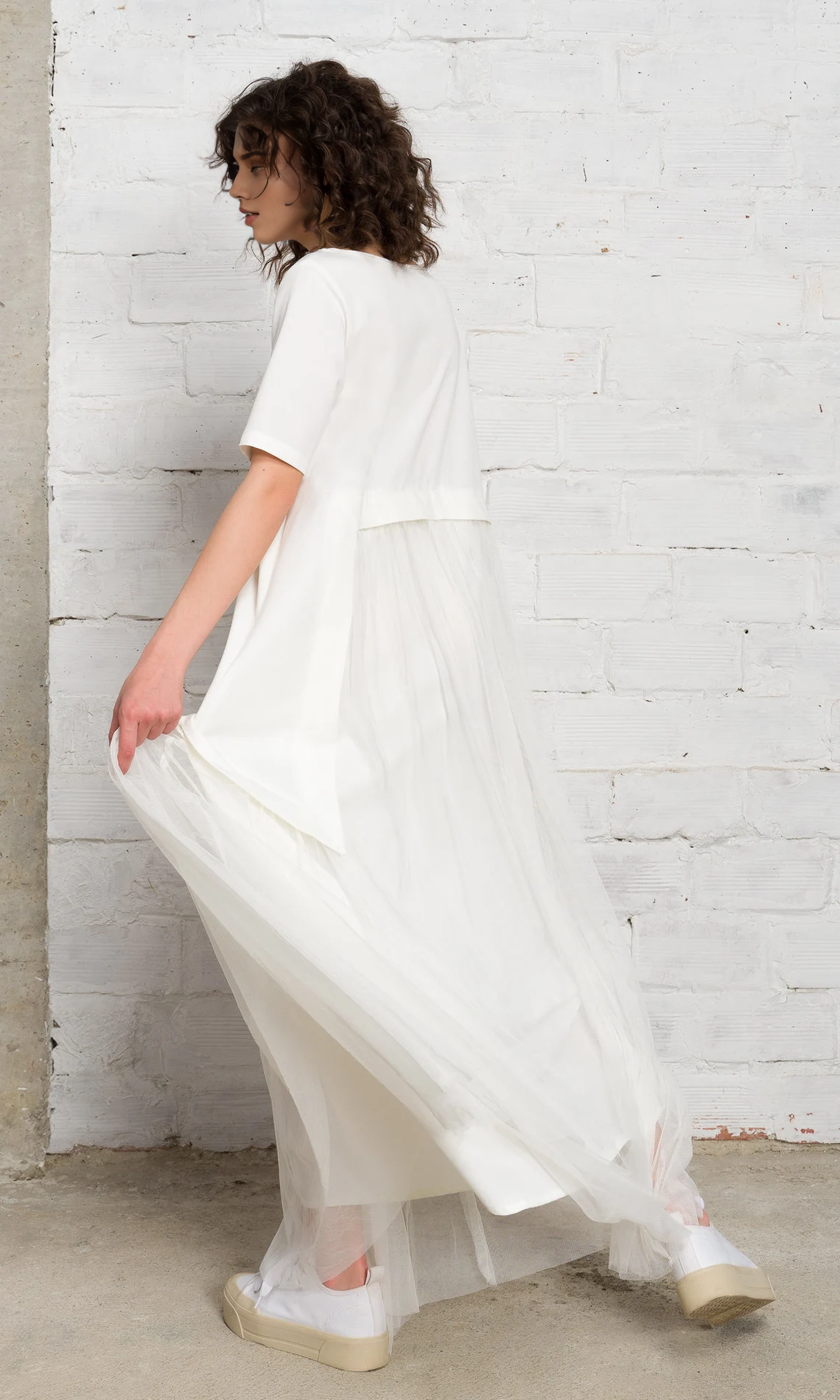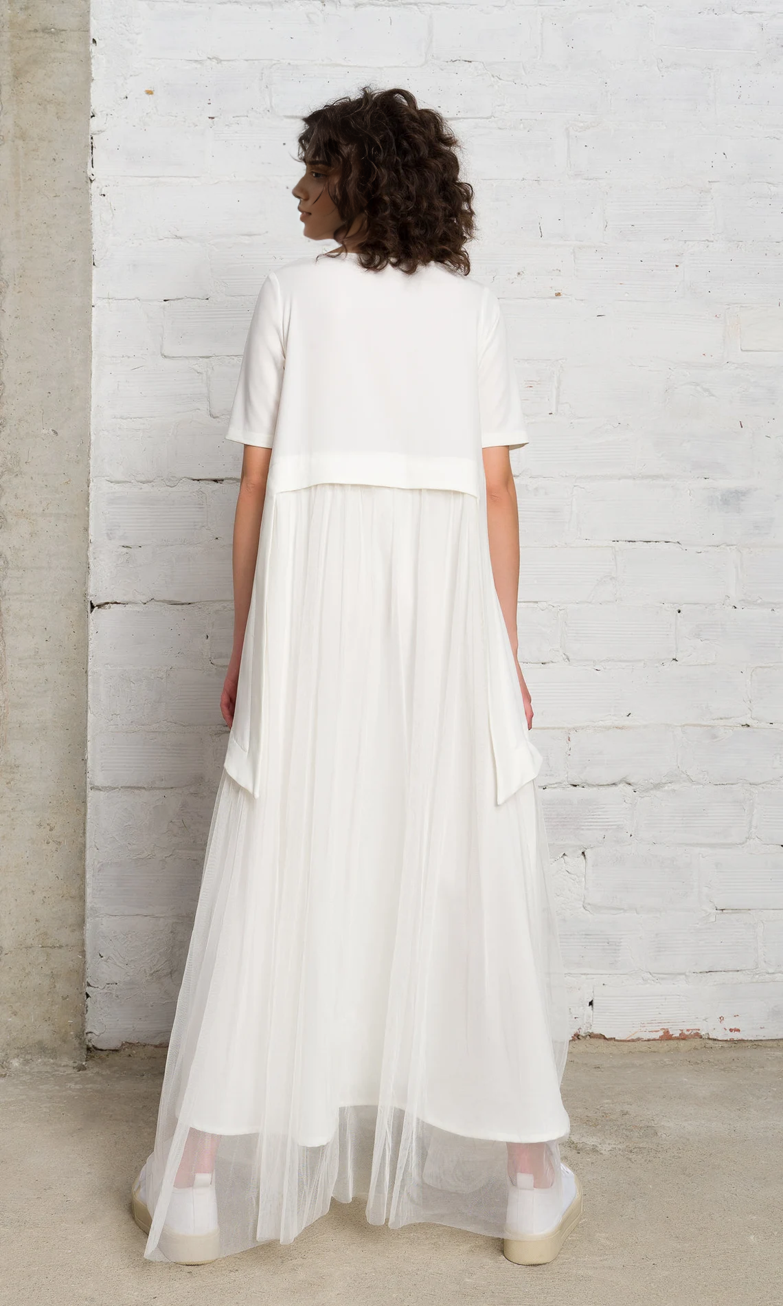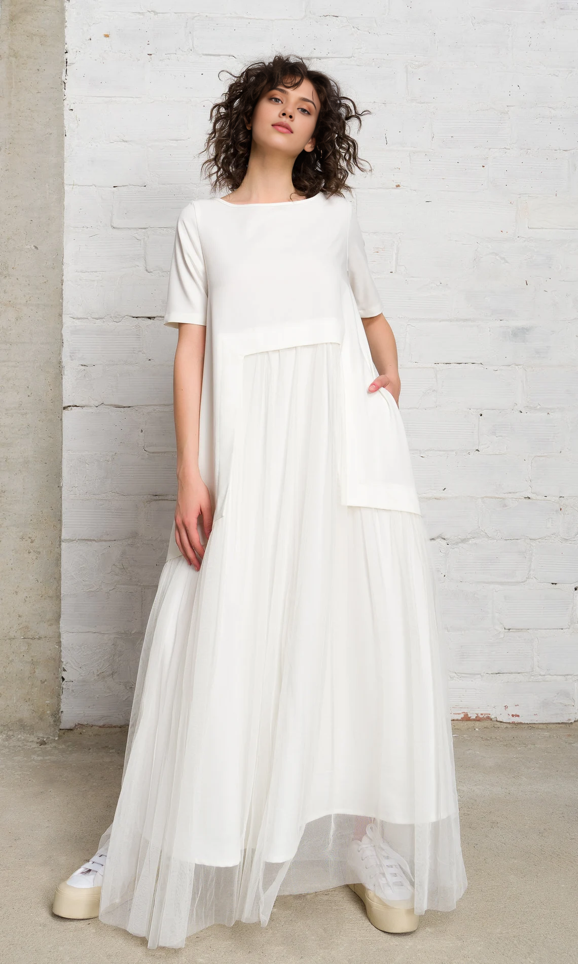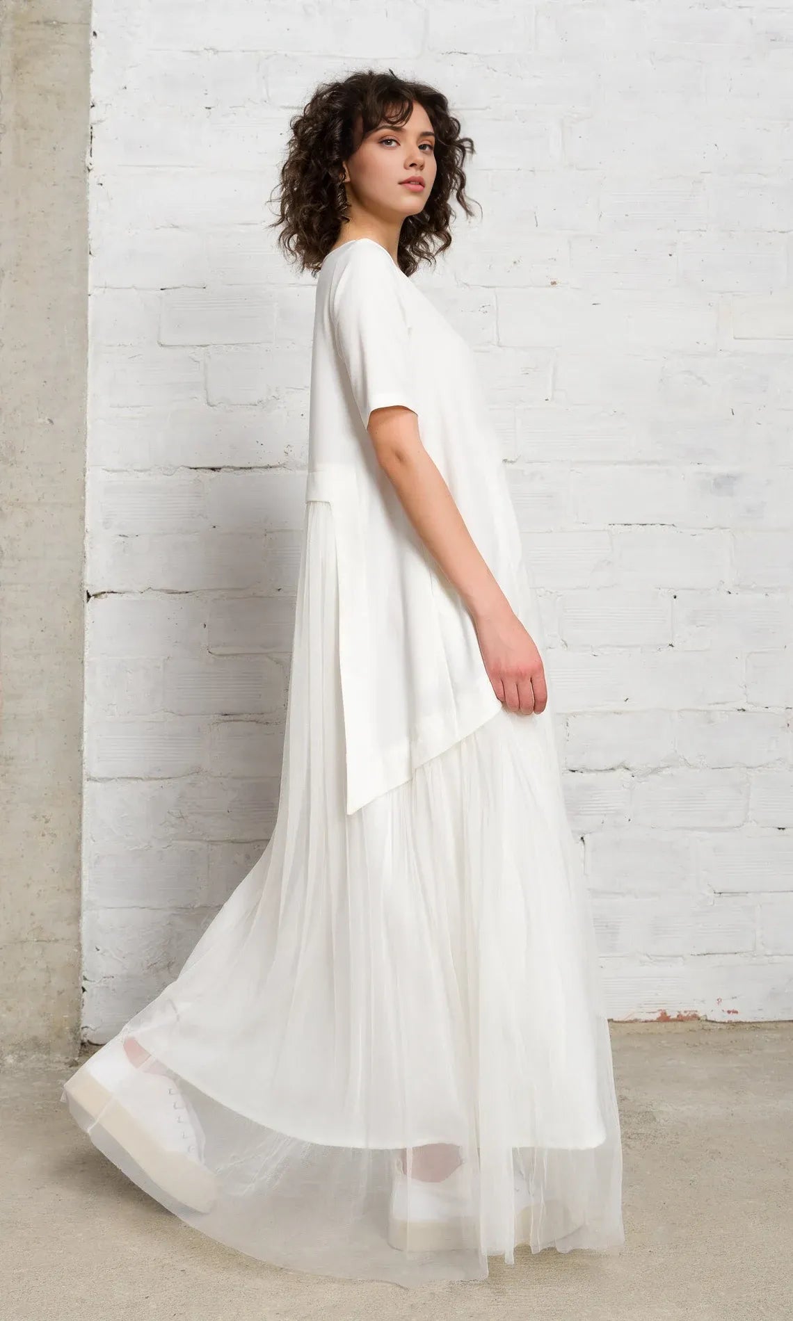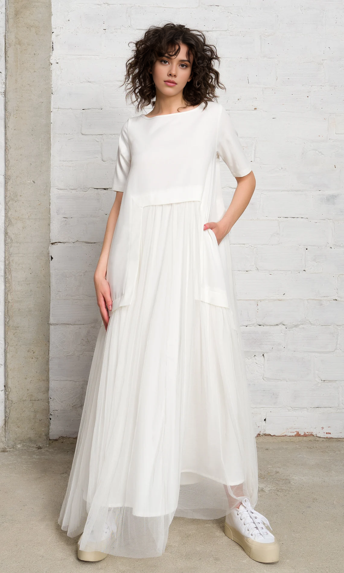 Vestido elegante de tul con cuello redondo, corte A, mangas cortas y largo hasta el suelo para fiesta de graduación
