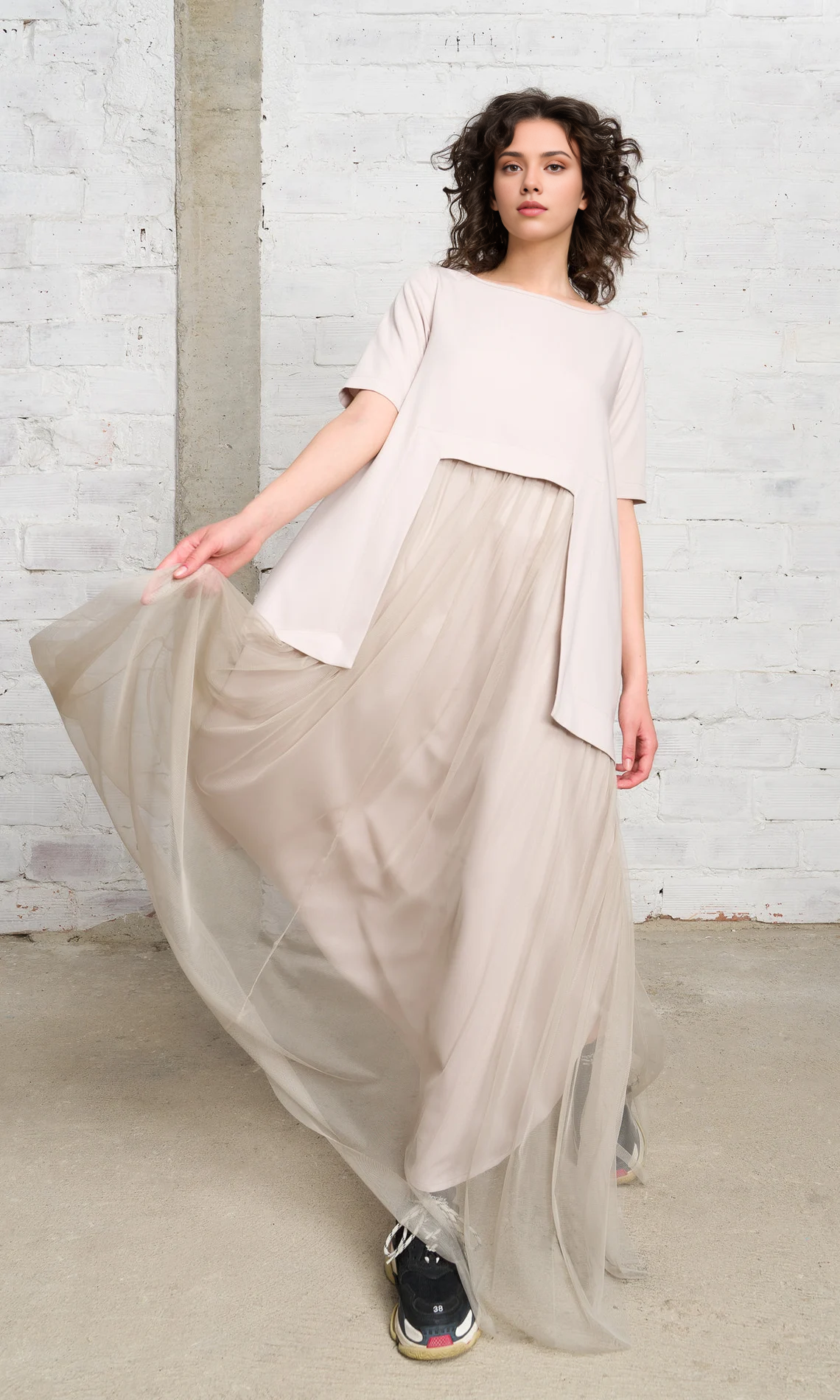 Vestido elegante de tul con cuello redondo, corte A, mangas cortas y largo hasta el suelo para fiesta de graduación - Beige / EE. UU. 2 / Reino Unido 6 / UE 32
