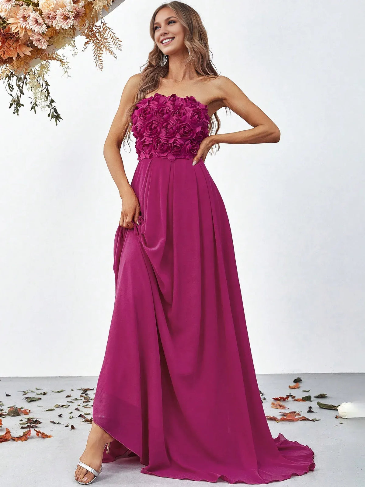 weitese's Elevate your romantic look with this magenta strapless maxi dress. It features a sculpted strapless bodice adorned with intricate 3D floral detailing for opulent allure, a flowing chiffon skirt for effortless movement, and a subtle train for dramatic elegance. The soft chiffon fabric ensures a graceful finish, making it perfect for weddings, formal events, or any occasion where you want to blend vibrant color with timeless sophistication.