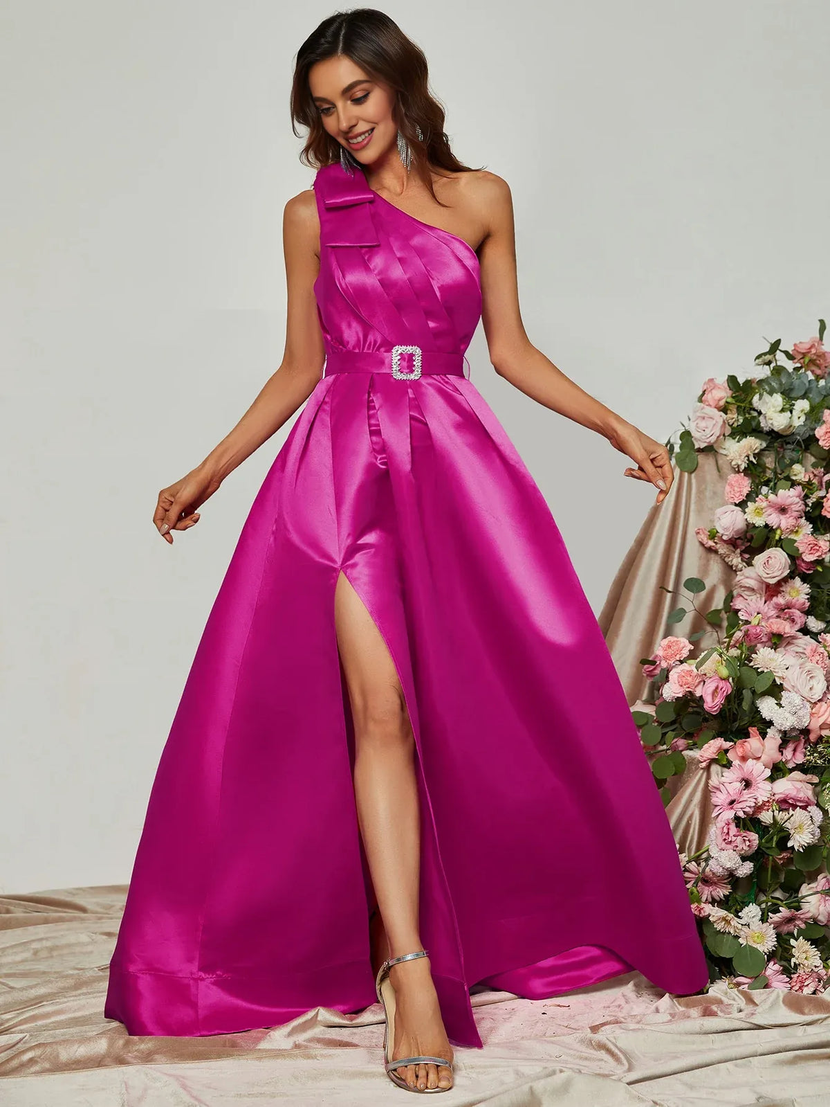 weitese's Elevate your formal look with this fuchsia satin one-shoulder maxi dress. It features a dramatic one-shoulder neckline with a statement bow detail for bold allure, a cinched waist with a rhinestone-embellished belt for sculpted charm, and a high side slit for modern flair. The lustrous satin fabric ensures a polished finish, making it perfect for red carpet events, formal galas, or any occasion where you want to blend vibrant color with timeless sophistication.