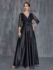 weitese's Elevate your sophisticated allure with this black lace and satin A-line maxi dress. It features a lace bodice with a V-neck and 3/4 sleeves for opulent allure, a satin A-line skirt with a bow-accented waist for refined charm, and a tailored design that blends elegance with timeless style. The classic black hue ensures a versatile finish, making it perfect for formal events, evening gatherings, or any occasion where you want to embrace luxurious textures with polished, classic flair.