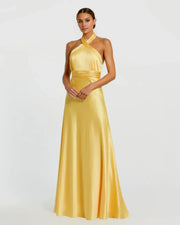 weitese's Elevate your radiant look with this golden yellow satin halter maxi dress. It features a chic halter neckline for modern allure, an open back with a dramatic bow detail for sophisticated charm, and a flowing satin silhouette for timeless grace. The luxurious fabric ensures a stunning drape, making it perfect for evening galas, formal events, or any occasion where you want to blend bold vibrancy with elegant style.