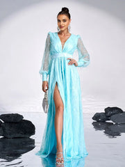 weitese's Elevate your ethereal look with this light blue sheer mesh maxi dress. It features a plunging V-neckline for daring charm, puff long sleeves with sheer mesh detailing for whimsical allure, and a high side slit for modern flair. The flowing silhouette with subtle embellishments ensures a graceful finish, making it perfect for formal events, evening galas, or any occasion where you want to blend delicate design with contemporary elegance.