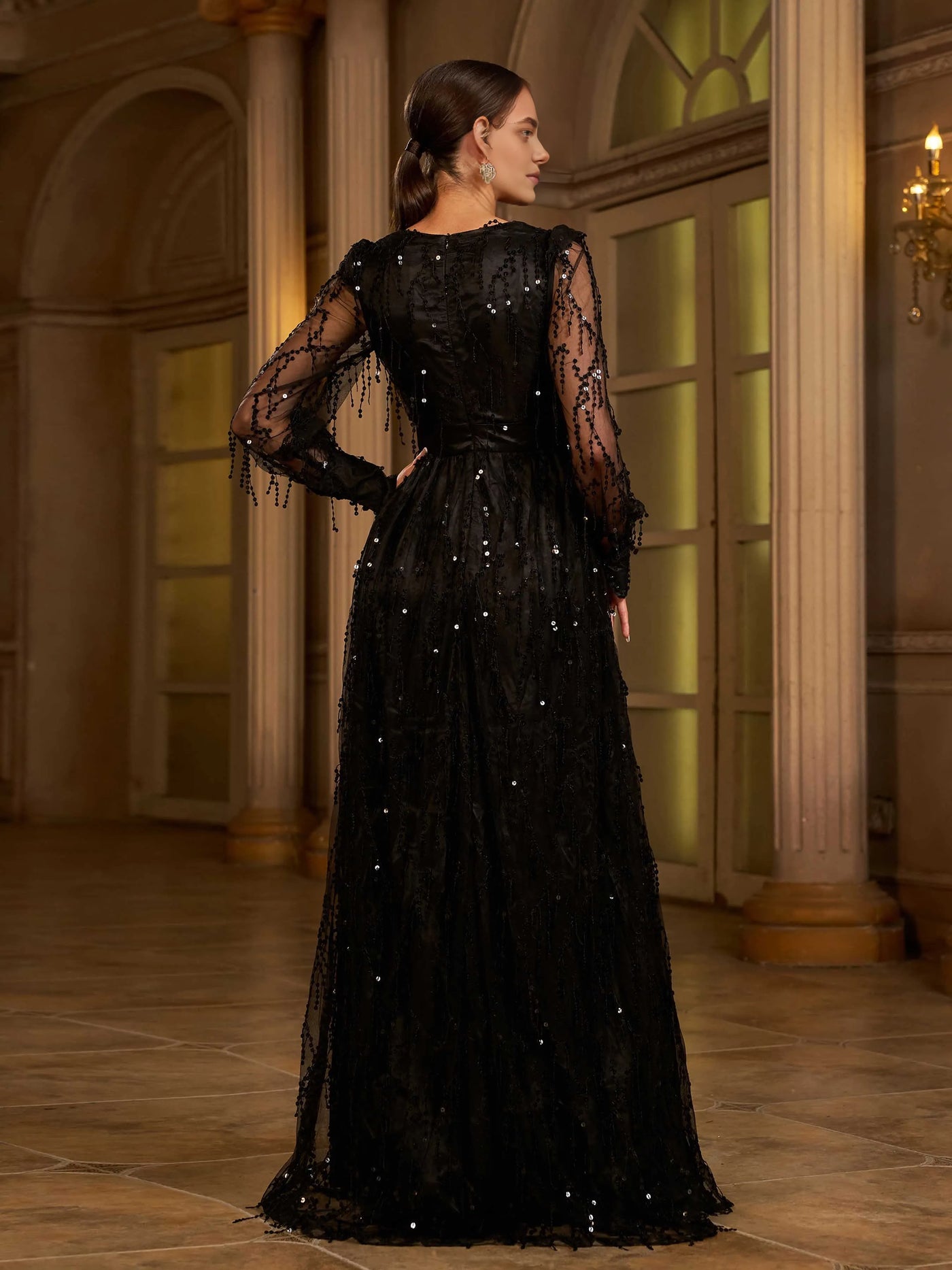 The Luxurious A-Line V Neck Long Sleeve Zipper Up Prom Dress For Sale does not include any accessories shown in the picture, such as a cape/jacket, gloves, veil, handbag, etc.