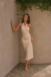 weitese's Elevate your elegant look with this ivory satin halter midi dress. It features a unique halter neckline for modern allure, an open back with tie detailing for sophisticated charm, and a smooth satin fabric for a luxurious drape. Perfect for summer weddings, cocktail parties, or any occasion where you want to blend classic grace with contemporary style.