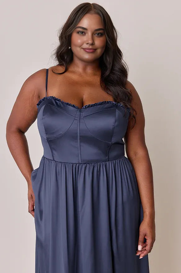 weitese's Embrace elegance in this plus size navy blue satin maxi dress. It features delicate spaghetti straps, a sweetheart neckline with ruffled detailing, and a flowy skirt with a side slit and ruffled hem. The satin fabric offers a luxurious sheen, while the empire waist creates a flattering silhouette. Perfect for weddings, formal events, or any occasion where you want to feel graceful and stylish.