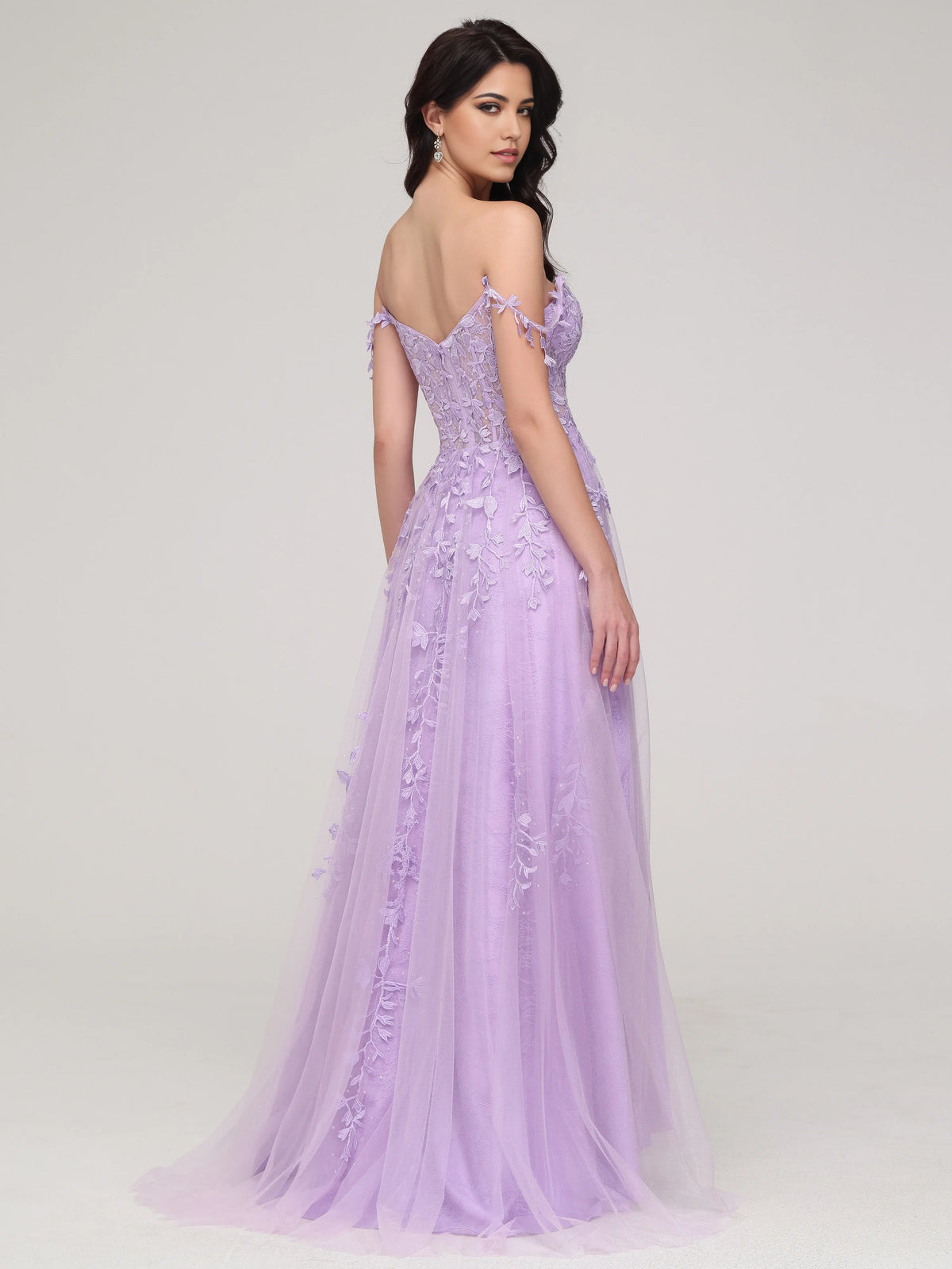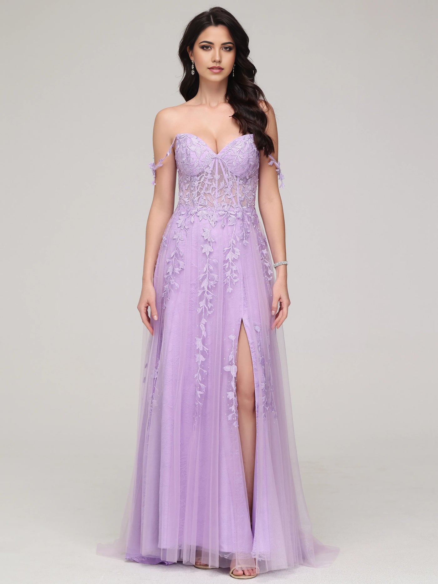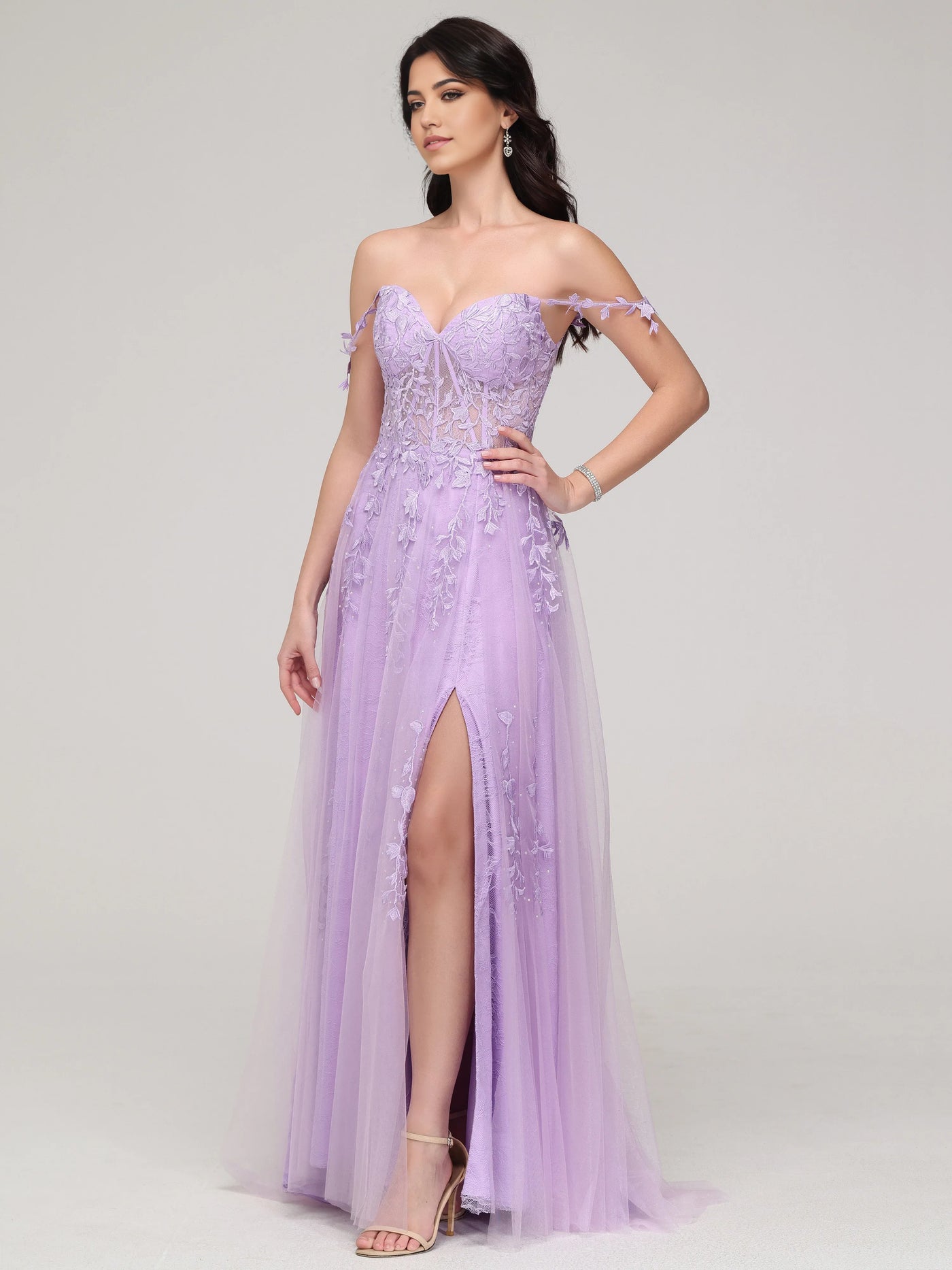 weitese's Elevate your formal look with this lilac off-shoulder lace applique tulle maxi dress. It features intricate lace applique on a tulle fabric for romantic charm, an off-shoulder design with a sweetheart neckline for elegant allure, and a high slit for dynamic movement. The flowing skirt offers graceful style, making it perfect for proms, weddings, or any occasion where you want to showcase timeless sophistication with a blend of delicate lace and airy tulle.
