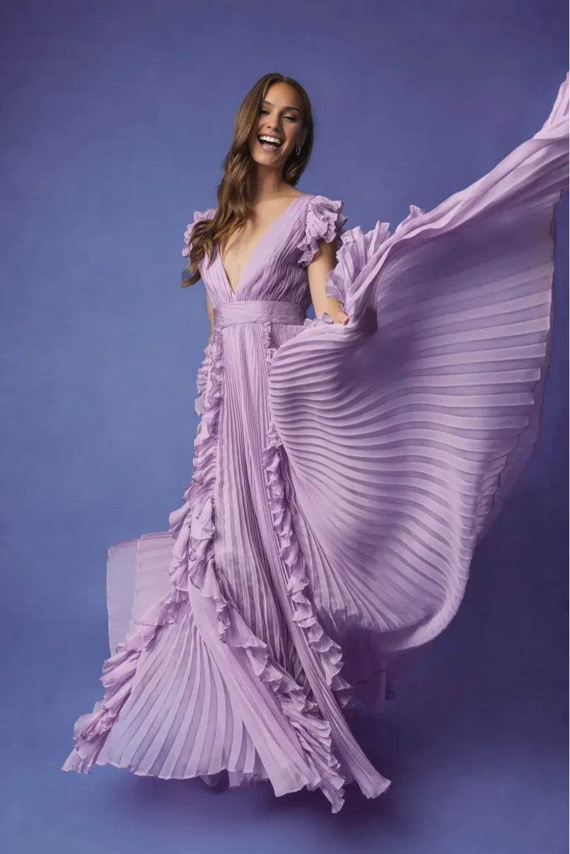 weitese's Elevate your romantic look with this lilac chiffon ruffled maxi dress. It features a deep V-neckline with ruffled cap sleeves for feminine allure, cascading ruffle details on the skirt for ethereal charm, and an open back for modern flair. The lightweight chiffon fabric ensures graceful movement, making it perfect for formal events, garden parties, or any occasion where you want to blend soft sophistication with whimsical elegance.